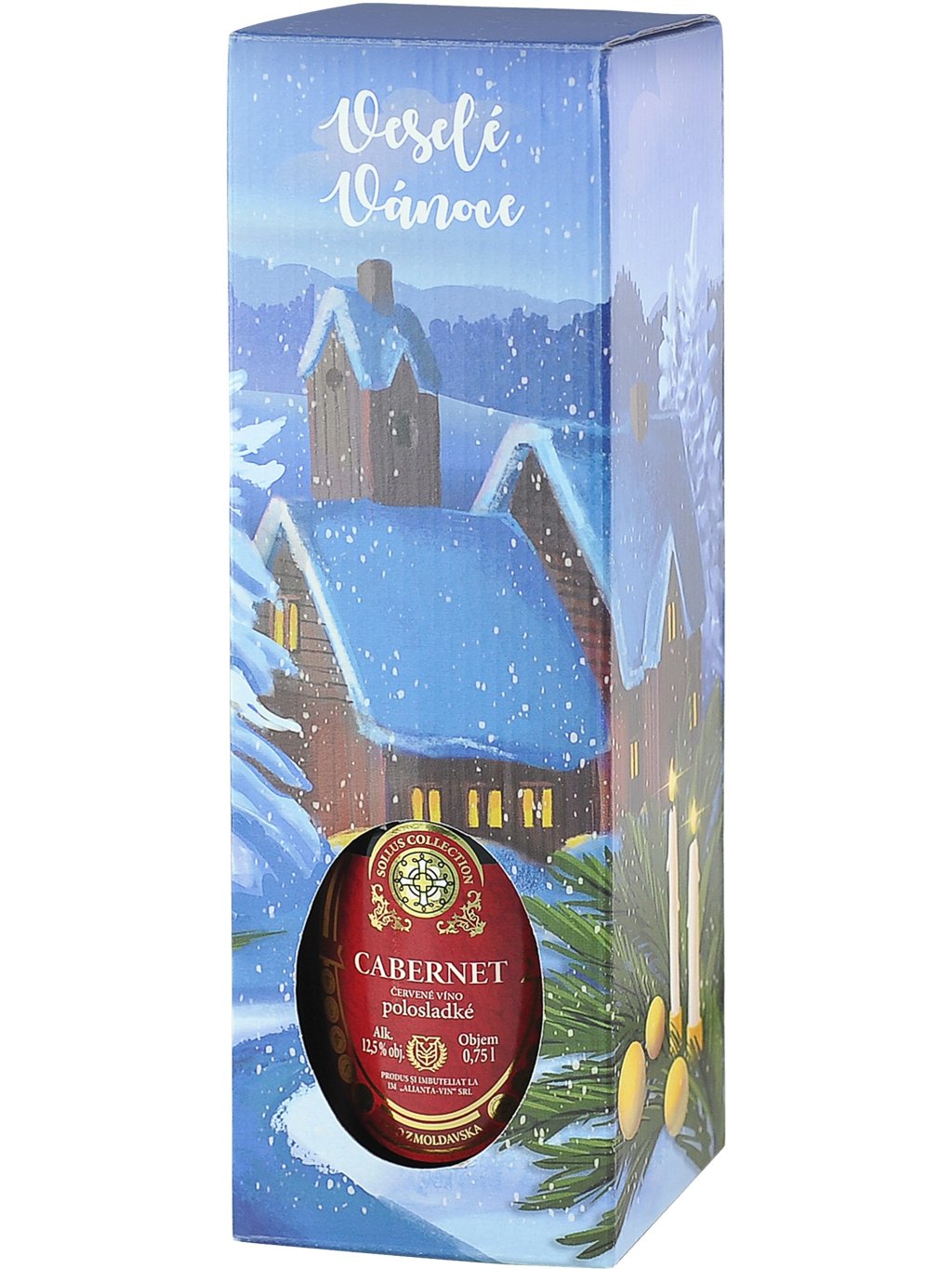 Odrůdové víno Cabernet, balené v dárkové krabičce Veselé Vánoce, má sytě červenou barvu, plné harmonické tělo s typickou vůní i chutí černého rybízu. Víno se hodí k pokrmům z masa, ryb a sýrů. Cabernet má 12,5% objemových alkoholu a přibližně 30 g/l zbytkového cukru. Objem: 0,75 l.