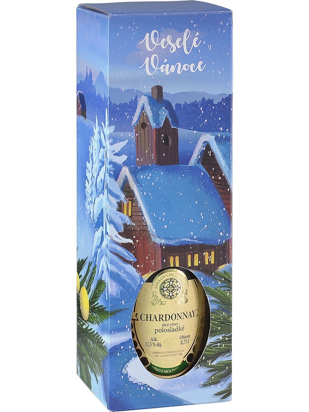 Odrůdové víno Chardonnay, balené v dárkové krabičce Veselé Vánoce, má světle slámovou barvu, jemnou, příjemně nasládlou chuť a vůni přezrálého ovoce s tóny broskví. Hodí se k rybám, plodům moře, měkkým sýrům a salátům. Chardonnay má 11,5% objemových alkoholu a přibližně 30 g/l zbytkového cukru. Objem: 0,75 l.